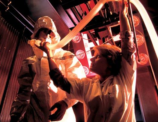 По бегущей дорожке скорым шагом идет мужчина. На нем общезащитный костюм, весь усеянный датчиками, от лицевой маски тянется длинный шланг к дыхательному аппарату. Термометр в помещении указывает на отметку 40 градусов выше нуля. Человеку, должно быть, тяжело двигаться, лицо залито потом, но вытереть нельзя — мешает шлем. Из-за стекла за действиями страдальца внимательно наблюдает другой человек — в белом халате, он проверяет показания датчиков на теле и оценивает физиологические параметры.