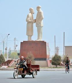Памятник исторической встрече уйгурского крестьянина Курбан Тулума с Мао Цзэдуном в уезде Керия. Отсюда Тулум на своем ослике (впоследствии прославившемся не менее хозяина) отправился в Пекин — сказать товарищу Мао, что жизнь в родном селе стала веселее