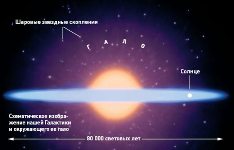 На сегодняшний день известно, что наша Галактика – это гигантская звездная система, включающая сотни миллиардов звезд. Все звезды, которые мы видим над головой в ясную ночь, принадлежат нашей Галактике. Если бы мы могли переместиться в пространстве и взглянуть на Млечный Путь со стороны, нашему взору предстал бы звездный город в виде огромной летающей тарелки поперечником в 100 тысяч световых лет. В ее центре мы бы увидели заметное утолщение– бар – диаметром 20 тысяч световых лет, от которого в пространство уходят исполинские спиральные ветви.
