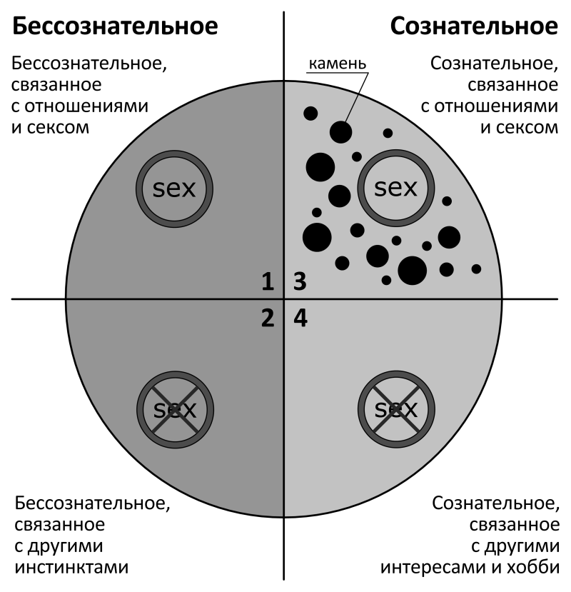 разделим мозг на связанное с сексом и не связанное с сексом. Сверху всё, связанное с сексом. Снизу всё, не связанное с сексом.Получили четыре сегмента (см. схему). Условные обозначения: