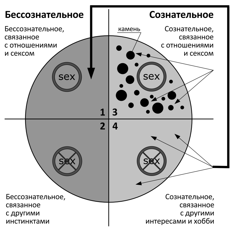 «Сознательное, связанное с сексом» (часть 3) — это чёрный ящик. Мы никогда не знаем, что там есть и чего там нет. Это работа для психолога, а в соблазнении нам не нужно над этим париться. Психологи, между прочим, самые смешные соблазнители, они всегда говорят о проблемах человека и лечат их.