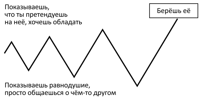 Например, в первый раз ты стараешься обнять её и взять за руку. Она не даётся, ты хватаешь её и обнимаешь сзади. Несколько минут трогаешь её, она сопротивляется, ты ведёшь себя как отморозок, который издаёт звуки орангутанга и просто глумится, потом резко меняешься в лице, становишься серьёзным, заводишь с ней серьёзный разговор. Она «отходит». Вы просто сидите и разговариваете. Ты налаживаешь с ней контакт, просто мило общаешься, без заигрываний,