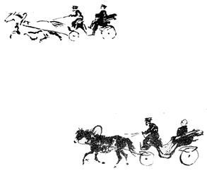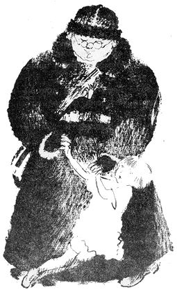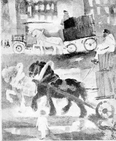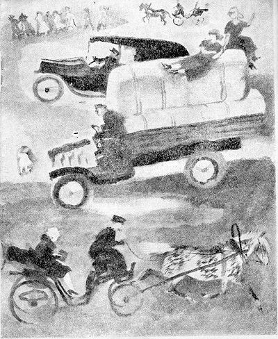 Первый раз была она на большой улице. А на улице — стук, гром, треск: лошади едут большие, мохнатые, на телегах ящики, на ящиках извозчики, дома до самого неба, трамваи так и мелькают, искры сверху сыплются. Идёт Майка, озирается, всем под ноги попадается. Вдруг на Майку мотор, Майка в сторону. А на неё лошадь, Майка в другую… а на неё другой мотор. Тут Майка зажмурилась и побежала через улицу.