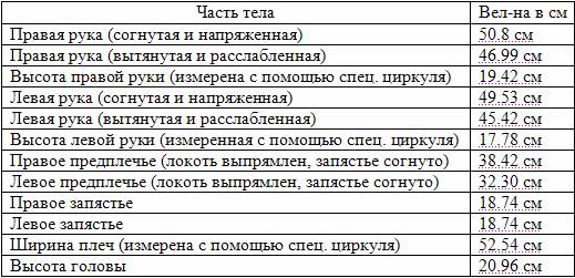 Другая черта, понравившаяся мне в Эде Робинсоне, проявилась сразу после нашей встречи. Мы сидели в кабинете спортзала, и я рассказывал о некоторых измерениях и фотографиях, которые я надеялся сделать в этот день. Например, я хотел тщательно измерить, использую тонкую измерительную ленту (обычно изготовляемую из газеты), о которой я подробно рассказывал в одной из предыдущих глав. Я хотел измерить специальным циркулем высоту его согнутых рук и сравнить их с высотой головы. Другие измерения, которые меня интересовали, были запястья, предплечья, ширина плеч и свободных рук.