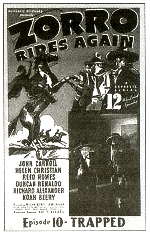 Остальные одиннадцать эпизодов рассказывают о выполнении этих задач. Пока Диего Вега вызывает раздражение сеньориты Волиты изнеженностью и трусоватостью, Зорро и его кавалеристы громят приспешников врага. Но самый главный враг жесток и коварен: подобно ночному разбойнику, Дон дель Оро тщательно бережет инкогнито — каждого, вознамерившегося произнести имя того, кто кроется под личиной индейского божка, пронзает пущенная злодейской рукой золотая стрела. Дон дель Оро носит герметичный золотой шлем, смахивающий на окрашенный каркас из папье-маше, и сверкающие доспехи. И в этом сериале Зорро (на нем не черная бандана, а маскарадная маска, под ним — не вороной, вопреки обыкновению, а белый конь) попадает во множество переделок: его заточают в тюремной камере со сдвигающимися стенами, запирают в подъемнике золотодобывающей шахты, бросают под копыта и колеса запряженного парой гнедых экипажа, под ним проваливается перекинутый через пропасть мост и так далее. Но все заканчивается благополучно: Дон дель Оро (губернатор дон Фелипе) разоблачен и сброшен в огненную западню, сердце Волиты принадлежит Диего Веге, а во главе вдруг проявивших миролюбие индейцев яки становится добрый вождь Кейла. Зорро покидает Мексику, посадив в кресло губернатора провинции дона Рамона, но обещает вернуться и повести в бой армию всадников в плащах с литерой Zв том случае, если над Сан-Мендолито сгустятся тучи. В главной роли Инглиш и Уитни заняли двадцативосьмилетнего в ту пору актера Рида Хэдли, которому приходилось прежде играть и героев, и злодеев.