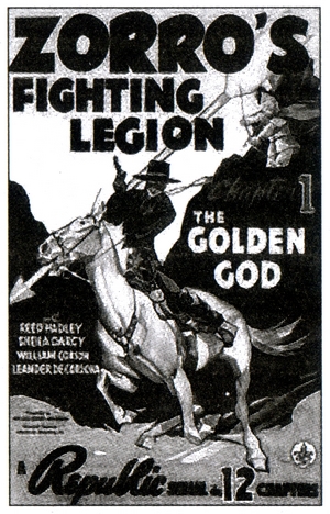 дух, несчастный просит оказавшегося рядом Зорро на мгновение приподнять маску — и умирает с гордостью за племянника, будучи уверенным в конечной победе добра. В подвигах Джеймса Веги активно участвует вороной по кличке Король, El Rey,потомок скакуна «первого» Зорро — Торнадо. Верный конь в конце концов и приканчивает бандита Волка, уже нацелившего револьвер на и без того раненного в руку потомка кабальеро. Тот же жеребец ускоряет и счастливое разрешение любовной интриги, подтолкнув Джойс Эндрюс в объятия Джеймса, вдруг, после побед над врагами, оробевшего перед девушкой.Вдохновленные железнодорожными успехами Зорро, через полтора года Инглиш и Уитни приступили к съемкам новой саги, задуманной как сиквел фильма Фербенкса. Действие нового сериала «Republic Pictures», получившего название «Армия Зорро сражается» («Zorro’s Fighting Legion»), происходит в 1820-х годах в только что завоевавшей «независимость от многовековой тирании» Мексике. Власти выдуманной провинции Сан-Мендолито озабочены добычей золота для молодой республики, которой управляет президент Бенито Хуарес. Настоящий Хуарес приступил к руководству страной примерно через тридцать лет после описанных в фильме событий, но съемочную группу это не смутило, тем более что и прочие повороты сюжета выглядят не слишком реальными. В рядах кабальеро из Сан-Мендолито оказались четверо предателей, «врагов Мексики», в их числе и губернатор провинции дон Фелипе. Эти негодяи, действуя заодно с самозваным богом индейского племени яки Доном дель Оро ( Don del Ого,«хозяин золота»), решили сорвать планы республиканцев. Транспорты с золотом из Сан-Мендолито один за другим попадали в руки дикарей. Индейское племя яки существует в действительности. В начале XIX века эти индейцы населяли теперь пограничные с Соединенными Штатами районы пустыни Сонора. В первые десятилетия после провозглашения независимости Мексики яки сражались за собственную независимость и относительно успешно сопротивлялись карательным экспедициям.