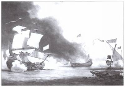 Английский корабль в бою с берберийскими корсарами. Художник В. ван де Вельде Младший