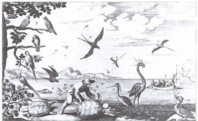 Французские колонисты ловят черепах — любимую пищу карибских буканьеров. Рисунок из «Общей истории» (1667–1671) Ж.-Б. дю Тертра