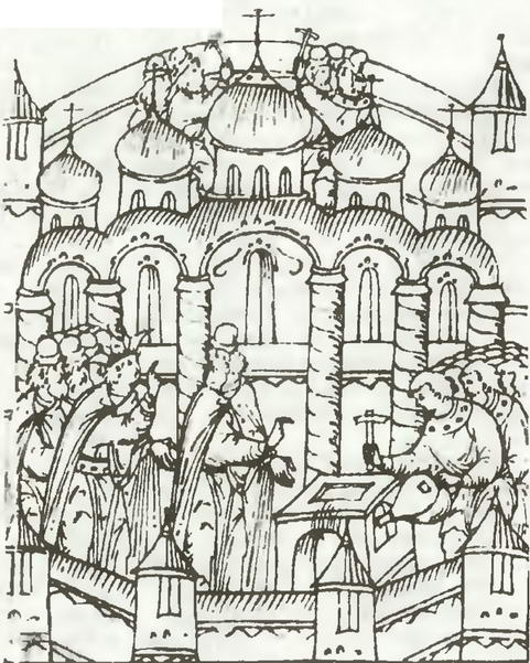 Золочение кровли Успенского собора в 1551 году. Миниатюра из Царственной книги