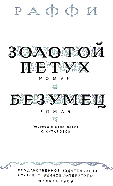 Среди произведений Раффи, посвященных критике буржуазного общества, бесспорно лучшим является его роман «Золотой петух». Написанный в начале 70-х годов, роман впервые был опубликован на страницах газеты «Мшак» только в 1879 году; с тех пор это произведение Раффи неоднократно переиздавалось на армянском языке, оно вышло также в переводах на русский и немецкий языки. Сюжетную канву романа составляет биография героя, сироты Кало (Микаела), который проходит сложный жизненный путь от деревенского подростка до торгового агента одного из купеческих домов. Читатель последовательно знакомится с условиями жизни и социальной средой, окружавшей героя в деревне, затем в городе (автор, очевидно, подразумевает Ереван) и, наконец, в армянской купеческой колонии в Москве. Однако центральной фигурой романа является не Микаел, а его хозяин — купец и ростовщик Петрос Масисян.