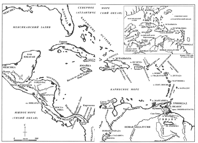 Половина его — материковые земли, изгиб береговой линии Южной и Центральной Америки от устья Ориноко до полуострова Юкатан: теперь эти берега принадлежат Венесуэле, Колумбии, Панаме, Коста-Рике, Никарагуа, Гондурасу, Гватемале и южной Мексике. Противоположная сторона изогнутой кромки составлена цепью островов, названия которых звучат перекличкой пышных тропиков: от Кубы (самого большого острова), через Ямайку, Эспаньолу (Гаити и Доминиканскую Республику), Пуэрто-Рико и Виргинские острова к Наветренным, а затем к Подветренным островам, и, наконец, обратно к Тринидаду, всего в двадцати милях от начальной точки в дельте Ориноко. Круг замыкается, и Карибское море, плотно замкнутое берегами, становится большим соленым озером с побережьями и островами, привычными географическими синонимами синего моря, ласковых ветров и уютных пейзажей, столь отличных от более диких и суровых гористых земель в глубине материка.