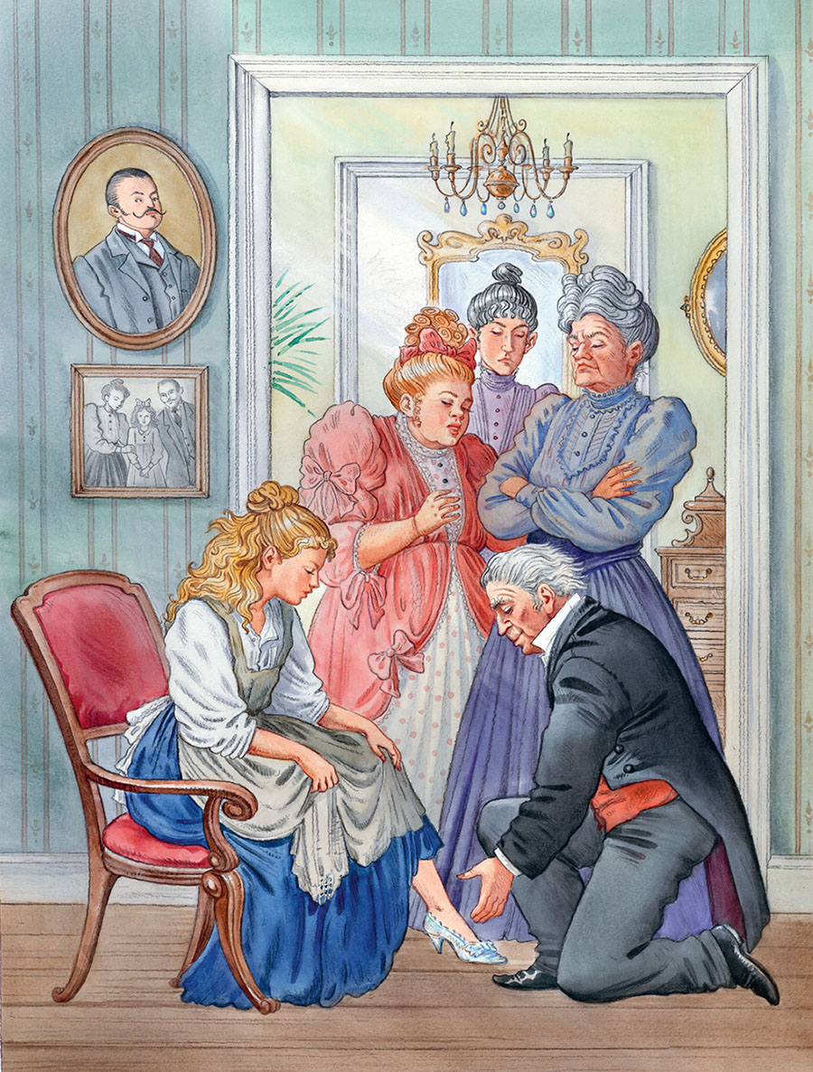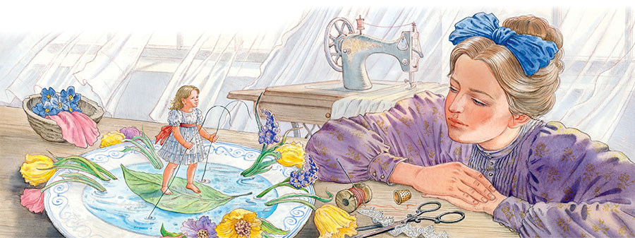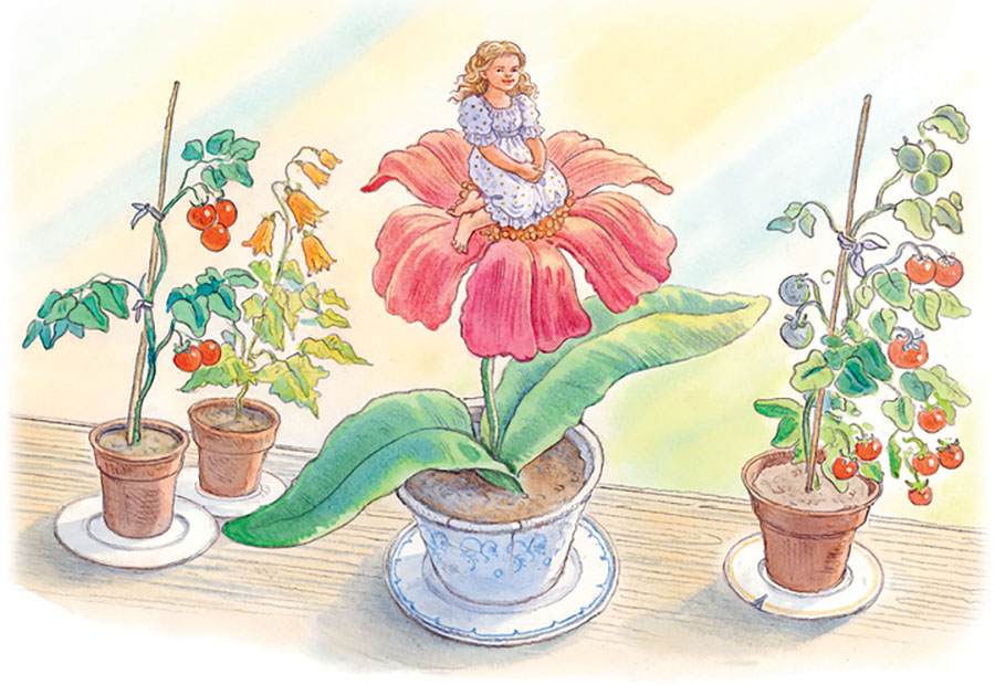 Что-то щёлкнуло, и цветок распустился совсем. Это был точь-в-точь тюльпан, но в самой чашечке на зелёном стульчике сидела крошечная девочка. Она была такая нежная, маленькая, всего с дюйм ростом, её и прозвали Дюймовочкой.