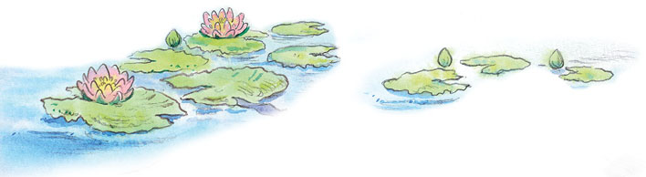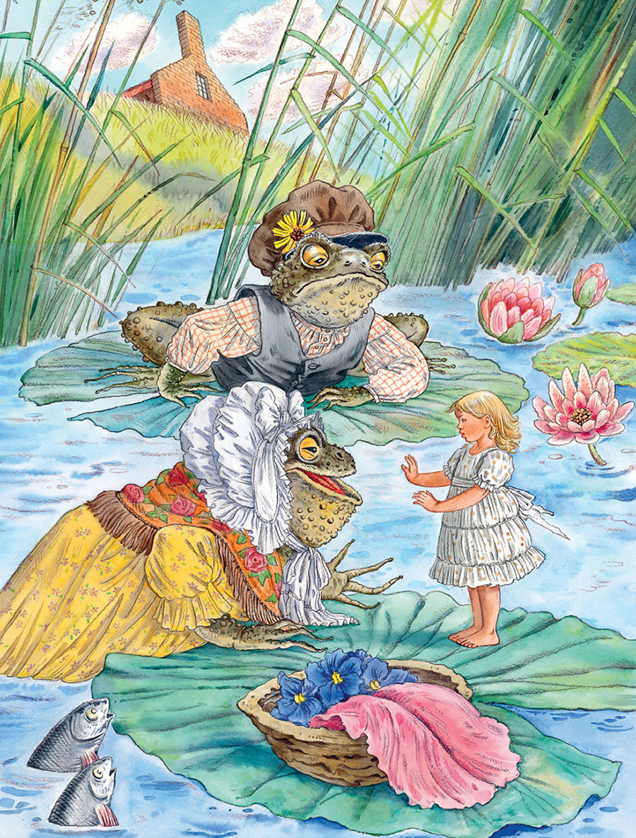 – Тише ты! Она ещё проснётся, пожалуй, да убежит от нас, – сказала старуха жаба. – Она ведь легче лебединого пуха! Высадим-ка её посредине реки на широкий лист кувшинки – это ведь целый остров для такой крошки, оттуда она не сбежит, а мы пока приберём там, внизу, наше гнёздышко. Вам ведь в нём жить да поживать.