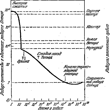 На рис. 5.1 схематически представлена зависимость радиуса протозвезды, первоначальная масса которой была равна массе Солнца, от времени. Для масштаба горизонтальные прерывистые линии соответствуют радиусам орбит планет Солнечной системы. Мы видим, что в начале «стадии свободного падения» сжимающейся под воздействием собственной гравитации протозвезды, еще недавно бывшей плотным, холодным «молекулярным» облаком, ее радиус близок к радиусу орбиты Плутона. При этом средняя концентрация частиц (преимущественно молекул водорода) была