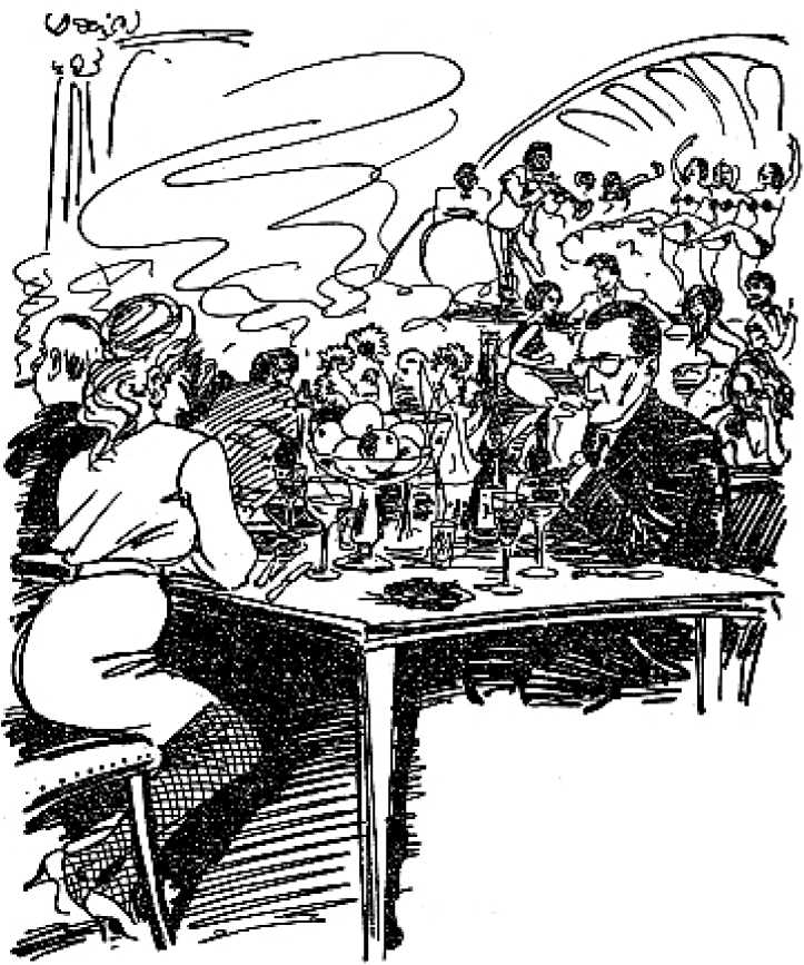 В роскошном ресторане гремели дикие и возбуждающие ритмы. Пахло ароматизированными сигаретами и едва уловимыми ароматами, которые исходят от красивых женщин. На зеркальной танцевальной площадке танцевало несколько пар, повинуясь хриплому голосу негра, певшего в микрофон. Рядом с ним жонглировал саксофоном какой-то мулат, вырывая из него воющие, плачущие и смеющиеся звуки. Почти все столики были заняты.